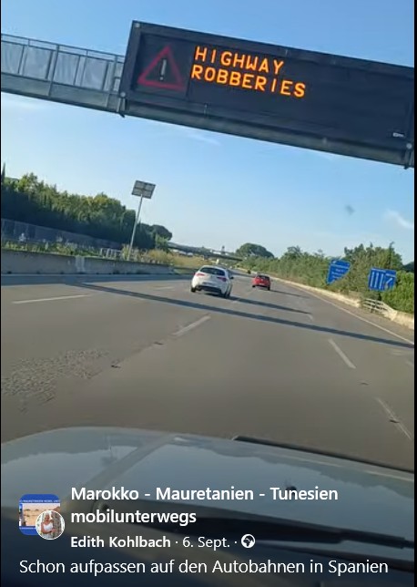 Das sind so die Tricks, die gerade in 2025 sehr häufig vorkommen. Und zwar entlang der A 7. Über die anderen Autobahnen, z.B. via Madrid, habe ich nichts gergleichen gehört. Aber ich kann nicht garantieren, dass es noch ganz andere gibt. In Marokko dagegen kann man sein Fahrzeug ohne Probleme überall abstellen.