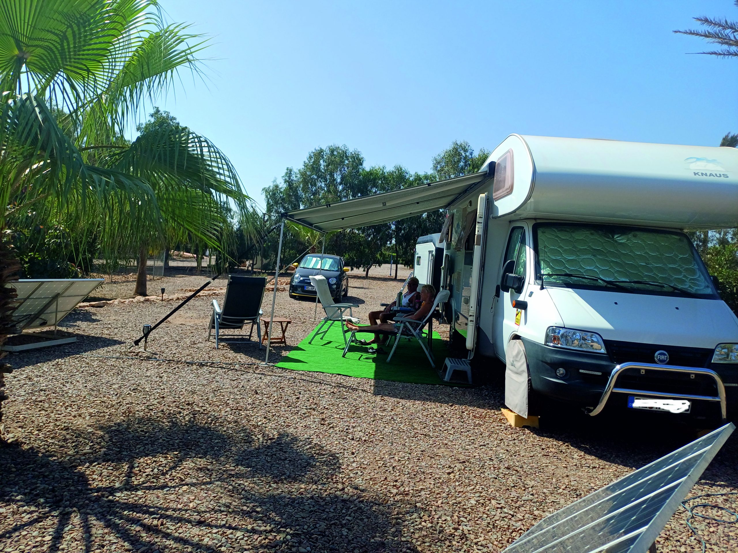 Dann kam aber der Höhepunkt an der Küste. Obwohl es 3 km vom Meer entfernt liegt. Die Palmeraie. Beim letzten Mal war ja gerade irgendein Feiertag und ich durfte nicht rein, aber diesmal hinderte mich nichts. Franzosen haben diesen Platz aufgebaut und er ist wirklich mit allem Komfort. In der Qualität nur noch mit Relais de Marrakech zu vergleichen. Hier gibt es keine ordentlich aufgereihten Stellplätze, sondern diese sind in dem riesigen, mit Büschen und Palmen bewachsenem Gebiet frei verteilt und unterschiedlich groß. Ich entdeckte ein deutsches Wohnmobil und sprach kurz mit ihnen. Also, ehrlich, die haben den Vogel abgeschossen. Besser kann man kaum überwintern. Hier ist ein Foto, das aber noch lange nicht ihr ganzes Grundstück zeigt, getrennt davon haben sie einen Anhänger mit PKW, zwei große Solarpanele und ein Sonnenzelt, wo ihre Außenküche untergebracht ist. Alles etwas höher gelegen, also wie eine Terrasse und fast 200 qm groß. Sie können es sich leisten, da der Platz um diese Zeit bei weitem nicht ausgelastet ist. Sie bleiben länger und kommen auch jedes Jahr wieder.