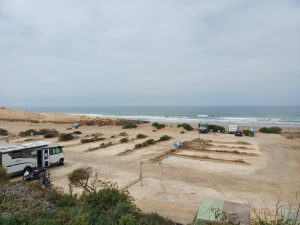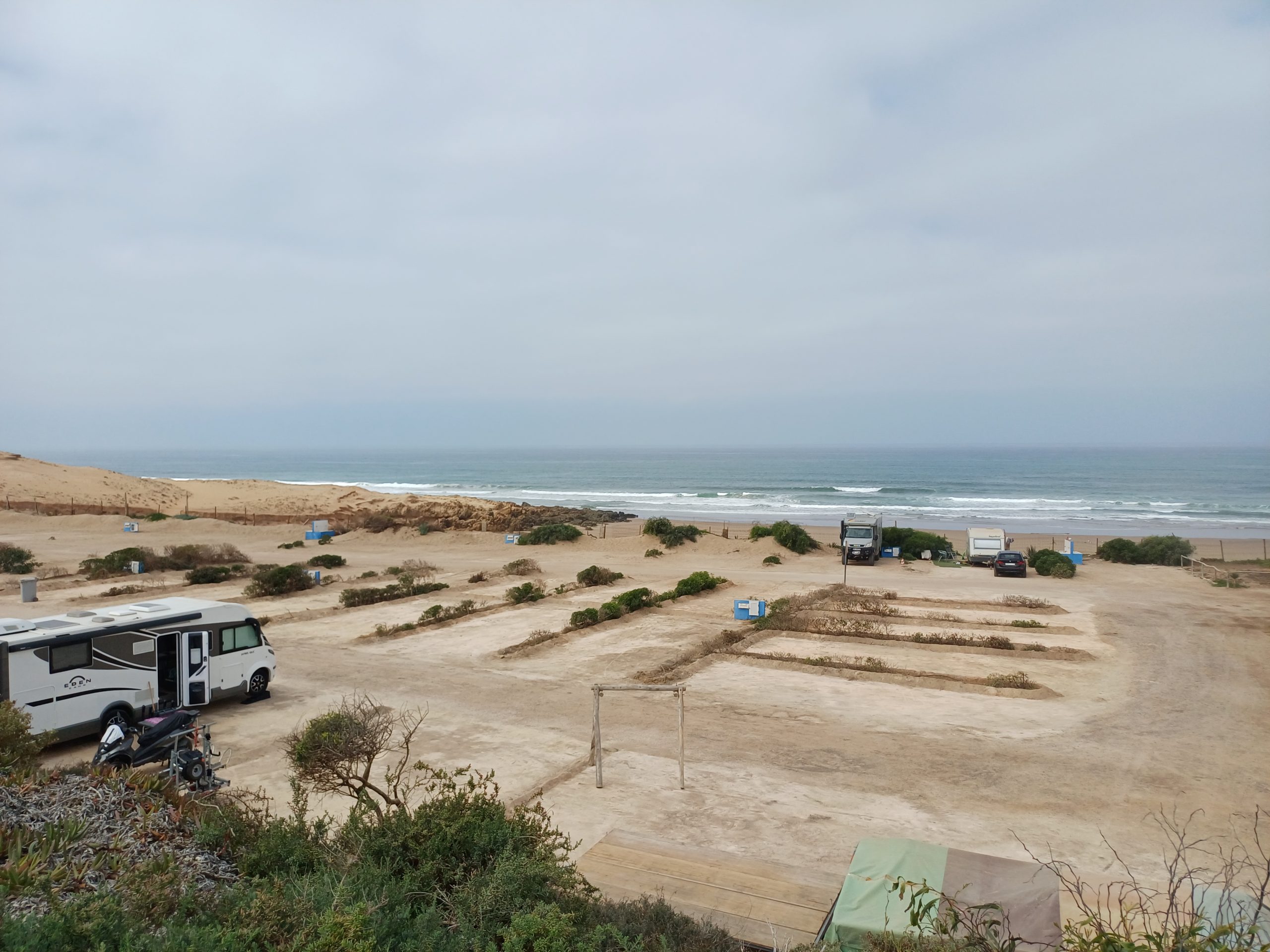 Wer nun aber wirklich Sand und Meer und frische Luft will, dem empfehle ich Sidi Wassay. Das ist der Platz am Atlantik, der am dichtesten dran ist und auch ordentliche Sanitäranlagen bietet. Luxus ist es nicht, aber sauber. Dazu gehört ein Restaurant, Schwimmbad, man kann auch in Mobilehomes wohnen und wenn man Glück hat, steht man ganz vorne am Strand. Näher geht es wirklich nicht. Dafür hat man allerdings eine Anfahrt von 16 km von der N 1 her, aber die ist inzwischen vollständig geteert und gut beschildert. Und der Naturpark liegt quasi vor der Tür.