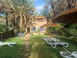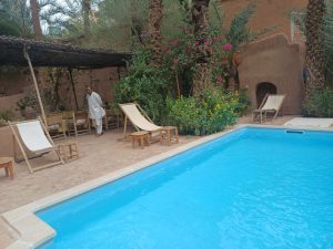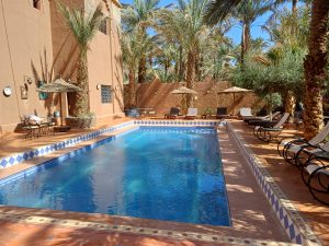 Riad Le Petit Jardin. Tief im Palmenhain von Amezrou versteckt liegt dieses idyllische Haus mit blühendem Garten unter hohen Palmen. Es gibt zehn geräumige Zimmer und einen schönen Pool im ausgedehnten Garten. Von der oberen Terrasse sind die Sanddünen zum Greifen nah. Am schönsten ist die Suite, von dort gibt es eine direkte Tür zum Pool. Ursprünglich wurde es von Holländern unter dem Namen Riad Marrat erbaut, zu der Zeit habe ich hier mal übernachtet, nun ist das Riad aber von den Besitzern des Hotels Perle de Dra gekauft und etwas erweitert worden. Sehr empfehlenswert, auch wenn ich unter dem neuen Namen hier noch nicht gewohnt habe. DZ/HP ab 950 DH.