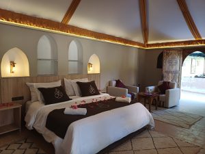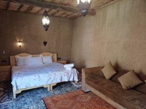 Riad Lamane. Auch dies ein ganz besonderes Haus, wenn auch komplett anders als Dar Sofian. Es liegt auf einem ausgedehnten Gelände im schattigen Palmenhain, man kann hier richtig spazieren gehen und am Anfang mag man Probleme haben, sein Zimmer wiederzufinden. Es gibt einen schönen Pool und ganz viele Liegen, auch eine Hammam, hier kann man richtig entspannen. Doch währen das Dar Sofian wirklich vorzügliche Küche bietet und alleine das am Tisch servierte Frühstück ein Erlebnis ist, so sind doch hier viele Gruppen, es gibt am Morgen ein Buffet, abends wird am Tisch serviert, aber doch eher das übliche Tajine. Was hier aber besonders ist und so schnell nicht mehr wiederzufinden, sind die Zimmer. Sie sind unglaublich einfallsreich dekoriert, fast jeder Raum ist anders, sehr groß, viele sind zu ebener Erde, so dass auch Rollstuhlfahrer alles genießen können. Von allen Hotels in Zagora die besten Zimmer. DZ/HP ab 1.200 DH.