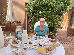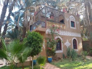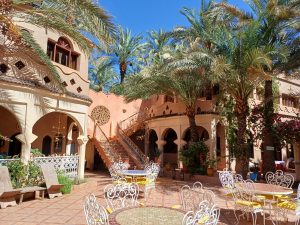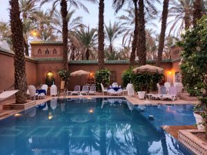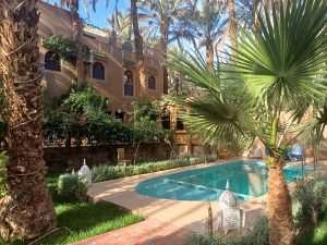 Riad Dar Sofian. Dieses Riad ist was ganz Besonderes im schattigen Palmenhain, es besticht vor allem durch seinen perfekten Service und das tolle Essen. Es ist eher wie ein Privathaus gehalten und vor­züg­lich und elegant einge­richtet. Die Betten laden direkt zum Kuscheln ein, die Klima­anlage wärmt im Winter sehr gut und kühlt im Sommer, was in Marokko nicht unbedingt selbstverständlich ist. Der Nachteil ist, es hat sehr viele Treppen, für Rollstuhlfahrer ist das nichts. Es war immer mein Lieblingshotel, aber es hat nur 10 Zimmer und die sind tatsächlich immer ausgebucht, so dass auch ich dort nicht mehr unterkomme. DZ/ÜF ab 880 DH.