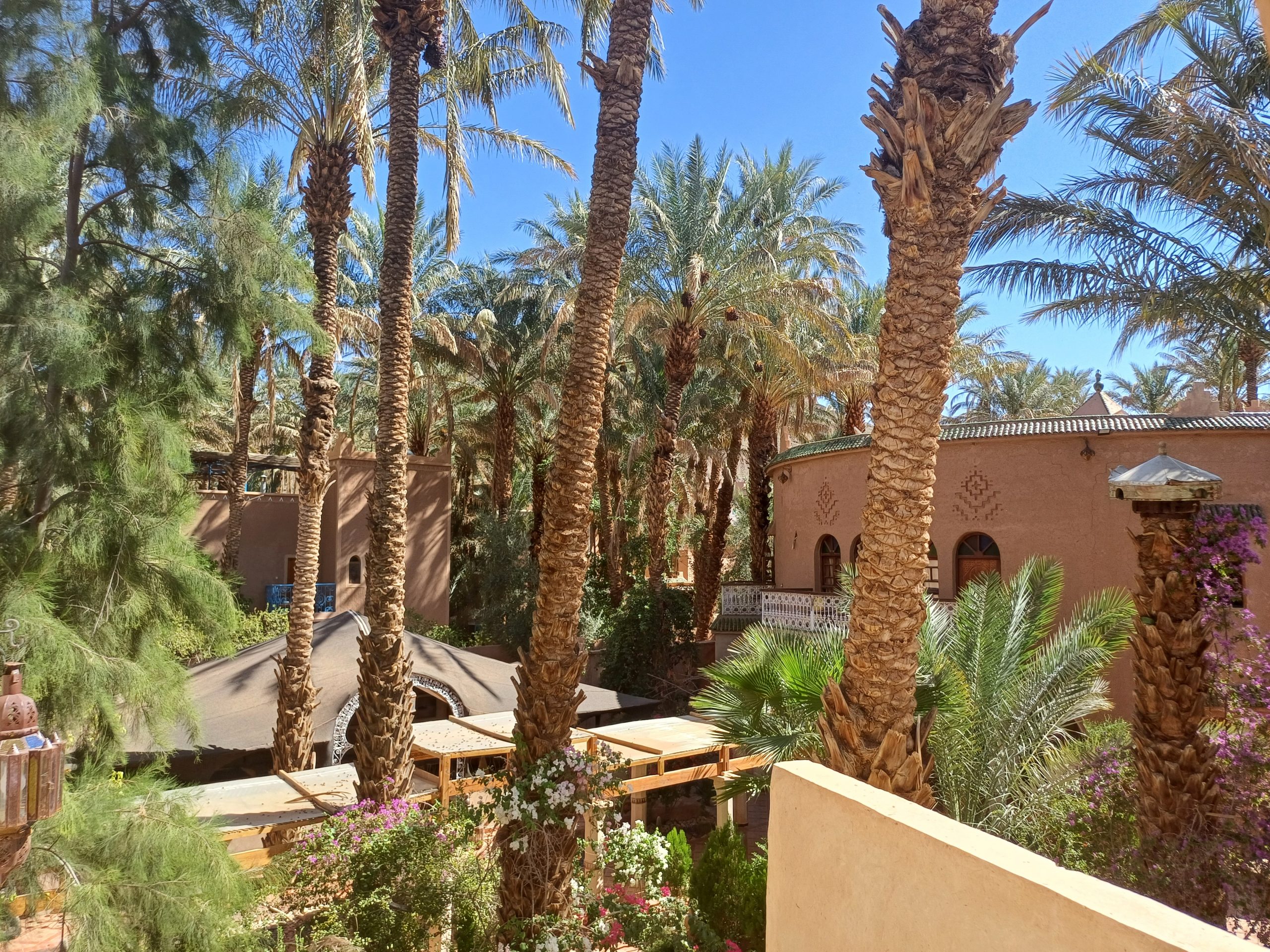 Riad Dar Sofian. Dieses Riad ist was ganz Besonderes im schattigen Palmenhain, es besticht vor allem durch seinen perfekten Service und das tolle Essen. Es ist eher wie ein Privathaus gehalten und vor­züg­lich und elegant einge­richtet. Die Betten laden direkt zum Kuscheln ein, die Klima­anlage wärmt im Winter sehr gut und kühlt im Sommer, was in Marokko nicht unbedingt selbstverständlich ist. Der Nachteil ist, es hat sehr viele Treppen, für Rollstuhlfahrer ist das nichts. Es war immer mein Lieblingshotel, aber es hat nur 10 Zimmer und die sind tatsächlich immer ausgebucht, so dass auch ich dort nicht mehr unterkomme. DZ/ÜF ab 880 DH.