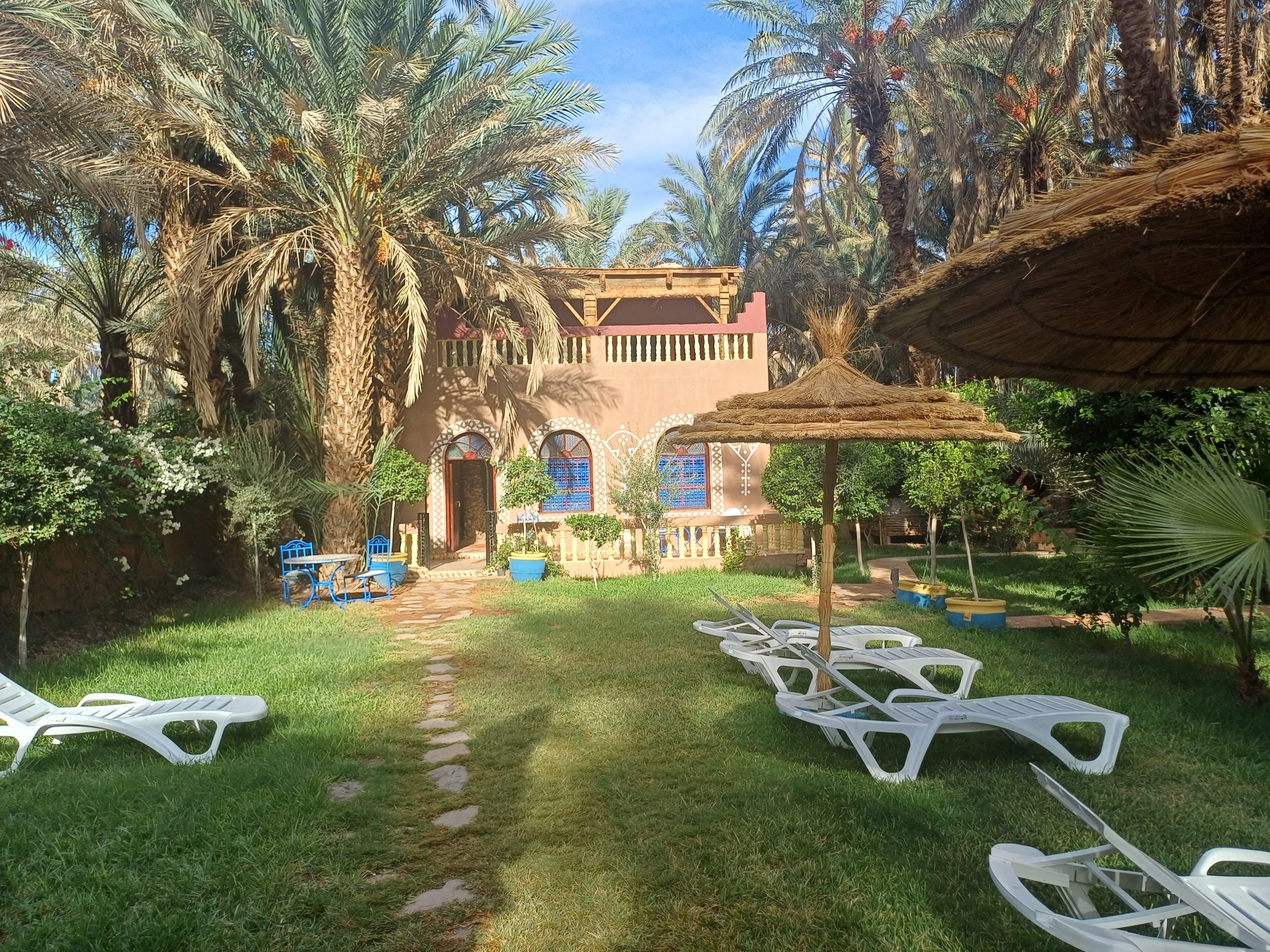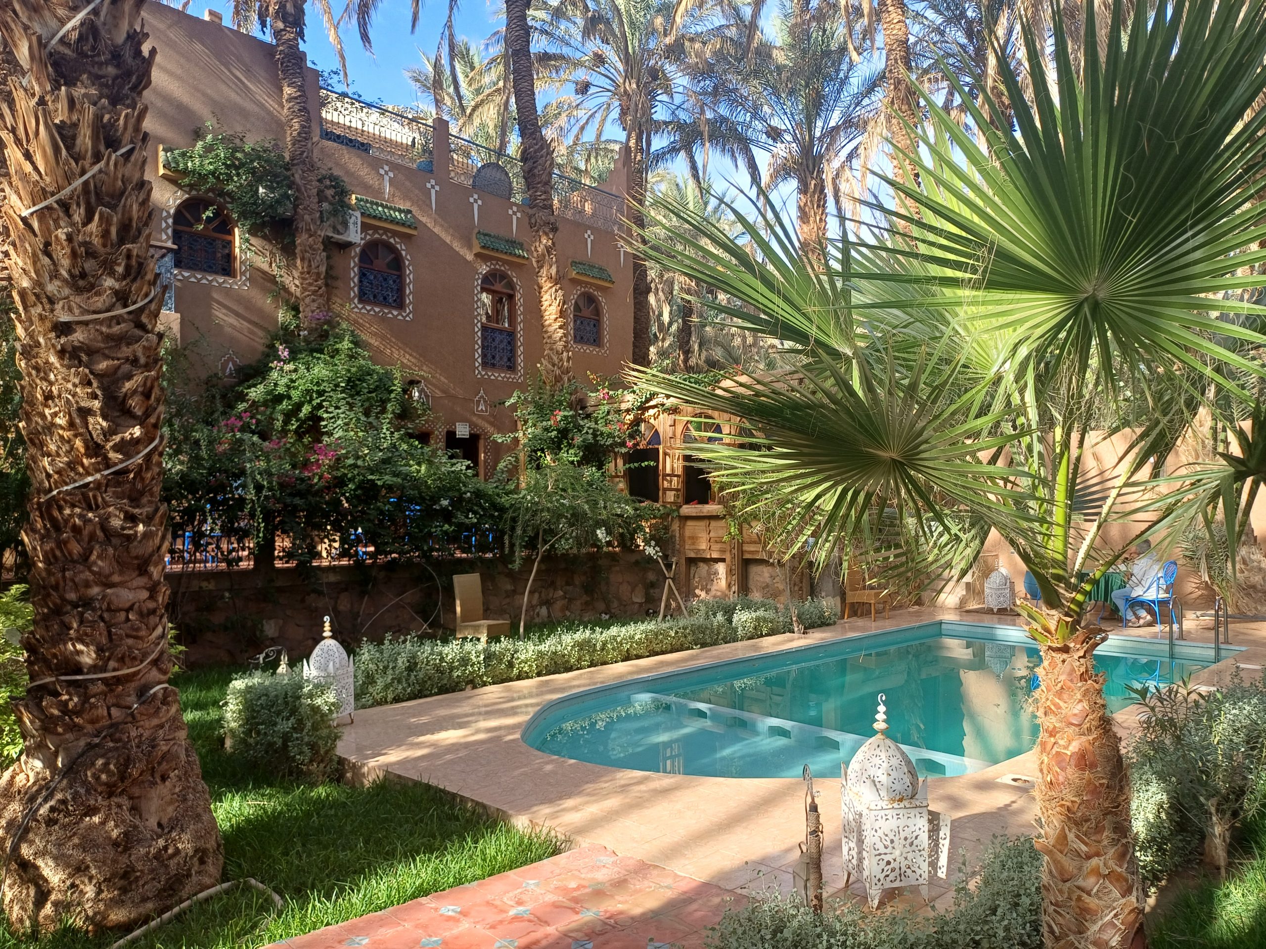 Riad Le Petit Jardin. Tief im Palmenhain von Amezrou versteckt liegt dieses idyllische Haus mit blühendem Garten unter hohen Palmen. Es gibt zehn geräumige Zimmer und einen schönen Pool im ausgedehnten Garten. Von der oberen Terrasse sind die Sanddünen zum Greifen nah. Am schönsten ist die Suite, von dort gibt es eine direkte Tür zum Pool. Ursprünglich wurde es von Holländern unter dem Namen Riad Marrat erbaut, zu der Zeit habe ich hier mal übernachtet, nun ist das Riad aber von den Besitzern des Hotels Perle de Dra gekauft und etwas erweitert worden. Sehr empfehlenswert, auch wenn ich unter dem neuen Namen hier noch nicht gewohnt habe. DZ/HP ab 950 DH.