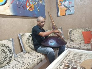 Aber diesmal ist es ganz besonders schön. Ihr Mann Lahcen ist auch da und spielt uns ein wenig vor auf einem dieser Gnaoua Instrumente, von dem ich den Namen nicht weiß. Aber dann holt er noch ein anderes Instrument, das ich noch nie gesehen habe, es klingt ein wenig nach Klangschalen. Madeleine will auch probieren, aber ganz so elegant wie Lahcen bekommt sie es nicht hin, ist ja auch das erstemal. Wir schauen uns wieder die Bilder an, auch die von den Sultanen, und den Beiden gefällt es richtig gut. Ihr Fahrer ist erstaunt, hat er dieses Atelier noch nie gesehen und wie so oft zeige ich den Marokkanern, was es alles Schöne in ihrem Lande gibt.