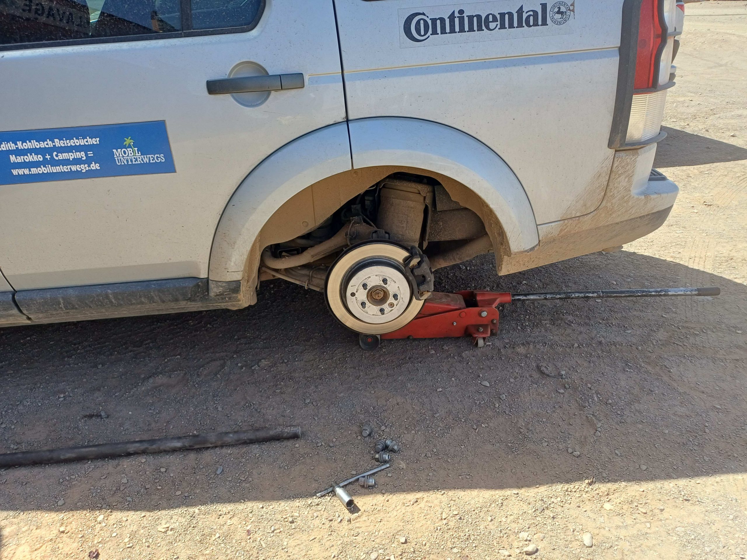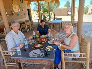 Und dann gehen wir essen. Auf so einer Rundreise fahren die Chauffeure mittags natürlich die Lokale an, von denen sie eine Kommission bekommen, und das sind nicht immer die besten, eher so eine Art Massenabfertigung. Im Fall Merzouga wäre das das Restaurant Nora in Khamlia, dort stehen mittags Kolonnen von Geländewagen. Doch gehe ich natürlich mit ihnen in das Restaurant, das ich erst kürzlich entdeckt habe, das Sahara Time mitten in den Dünen. Dort kommen keine Chauffeure hin, gibt es doch keine Kommission. Die zwei sind begeistert, doch kann ich ihre Freude zunächst nicht teilen, denn ich entdecke, dass mein Reifen Luft verliert. Aber ich kann noch fahren und so geht es gleich in die Werkstatt. Der Nagel wird entfernt, das Loch geflickt und ich komme zurück ins Restaurant, noch bevor das Essen auf dem Tisch steht. Meine Freunde sind begeistert, sie sagen, das war das beste Essen bisher auf der Reise.
