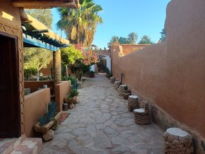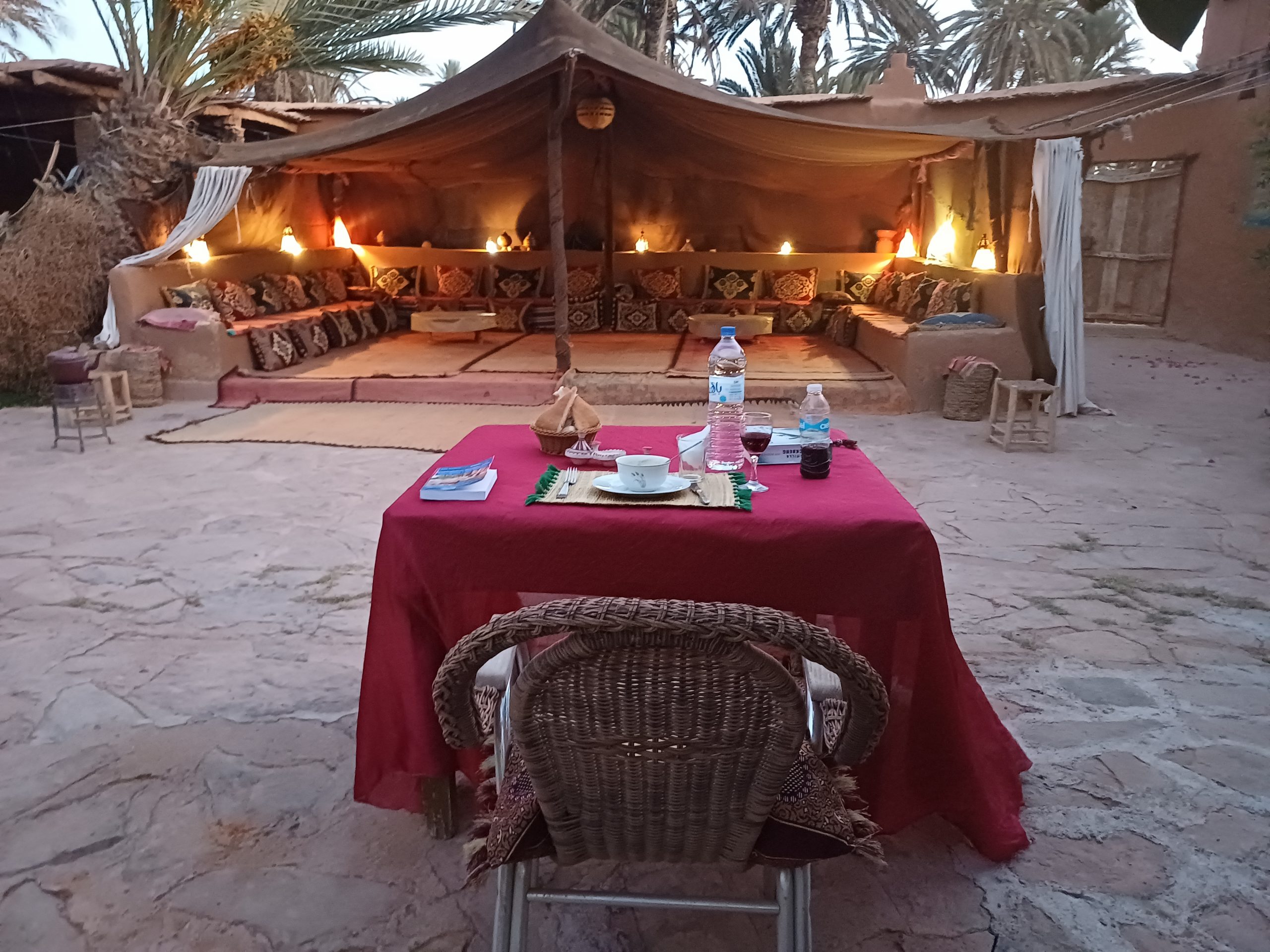 Die erste Station auf dieser Tour war Ksar Tafnidilt, selbstverständlich in meinen Büchern enthalten. Campingplatz und Hotel, beides, und sehr schön. Doch ihr lieben Wohnmobilisten, wenn ihr meint, dass ihr nun dort hin fahren sollt, lasst es bleiben. Die 7 km Piste bis dorthin sind nichts für euch. Es geht nicht nur über Felsbrocken, sondern vor allem auch über sandige Strecken, und ihr würdet schon auf dem ersten Kilometer stecken bleiben. Diese Etappenstation ist wirklich nur für geländegängige Fahrzeuge. Doch die werden belohnt, es ist sehr hübsch dort und die Französin Magali empfängt euch sehr freundlich. Der Pool war zwar nicht zum reinspringen, aber die Zimmer sind sehr gut, inzwischen gibt es 11 mit Bad, und 10 ohne, und natürlich ist hinter den Haus ein Campingbereich und saubere Sanitäranlagen.