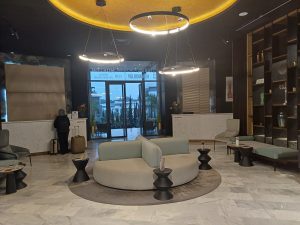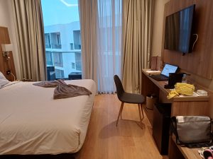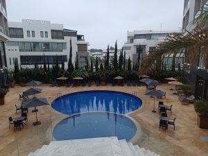 Das Hotel habe ich versehentlich gebucht. Ich hatte ein komplett anderes im Kopf, in einer ganz anderen Gegend, und war total enttäuscht, als ich hier ankam und feststellen musste, dass es nicht das ist, was ich wollte. Aber gebucht und bezahlt und nicht mehr zu ändern. Aber so langsam gewöhne ich mich daran und muss sagen, es ist ein sehr angenehmes Hotel. Offensichtlich sehr neu, im neuen Viertel Founty gelegen, also zur Innenstadt sehr weit. Aber ich will mich ja auch hauptsächlich im Zimmer einschließen und arbeiten. Obwohl ich bei der Ankunft wegen meiner Enttäuschung ziemlich unfreundlich war, hat mich das Mädel an der Rezeption doch sehr nett behandelt und mir sogar ein Zimmer ganz oben und mit Blick auf den Pool gegeben, was so nicht gebucht war. Es ist aber offensichtlich mehr ein Business-Hotel als ein Urlauber Ressort. Es sind viele Geschäftsreisende da, deshalb gibt es auch schon ab 7 Uhr Frühstück, ideal für mich Morgenmensch. 6 Uhr aufstehen, etwas arbeiten, 7 Uhr runter zum kleinen Frühstück, wieder arbeiten, dann vor 11 Uhr, dem Ende, schnell nochmal runter für einen Kaffee und ein Croissant. Diese Freiheit hatte ich in den Rundreisehotels nicht.