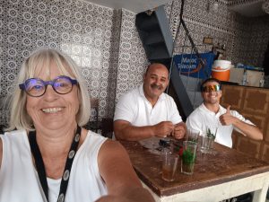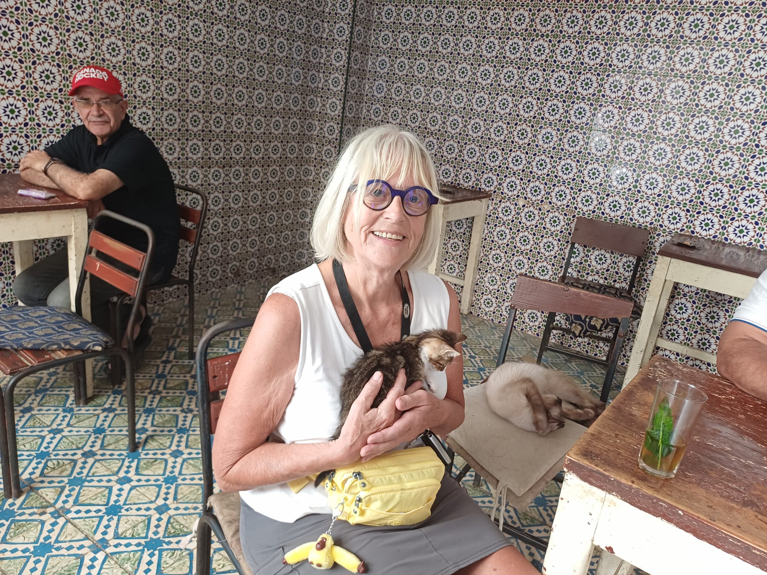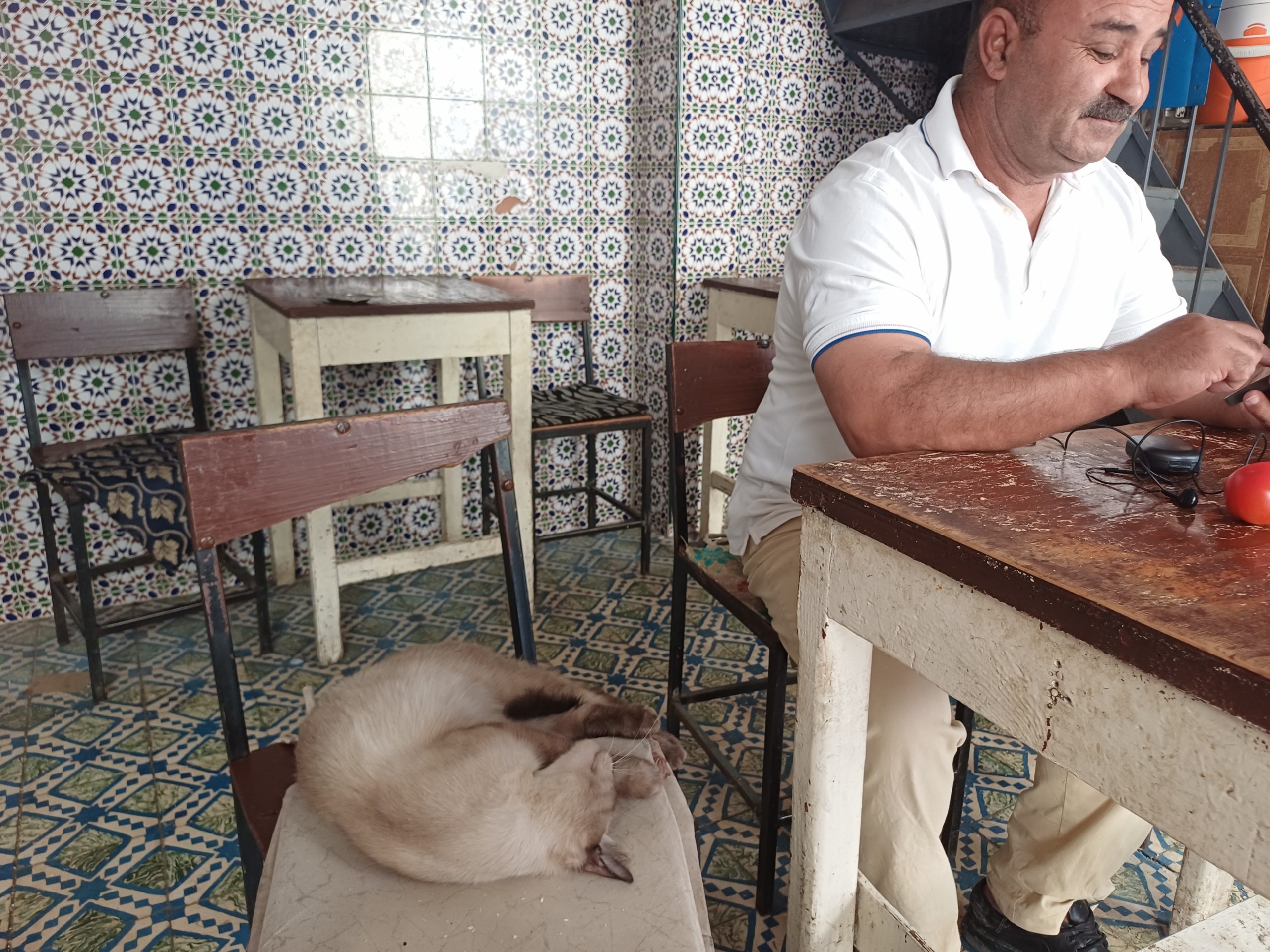 Dann kam ich an einem Café vorbei, darin zwei Männer, die mich so freundlich hineingewunken haben, dass ich das gerne angenommen habe. Zu Anfang war es etwas schwer, einen Platz zu finden, da alle Stühle von schlafenden Katzen belegt waren. Aber Mohammed fand noch einen. Es war richtig nett mit den beiden, Mohammed war mal mit einer Deutschen verheiratet, die aber leider schon vor Jahren bei einem Unfall verstorben ist.